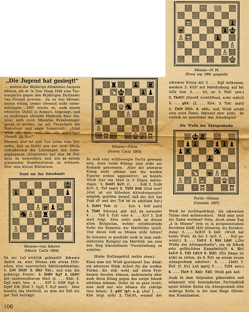 This article appeared after the death of Jacques Mieses on February 23, 1954 in London. It honors the life's work of the grandmaster and shows some of his most beautiful combinations.