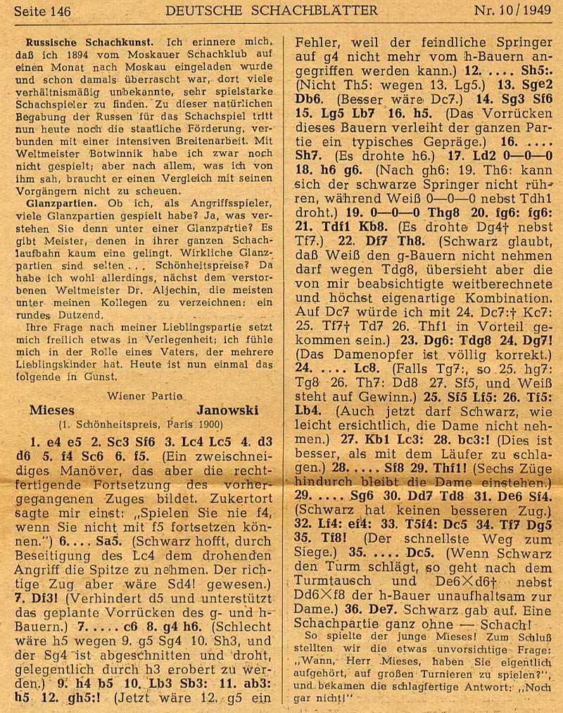 An extensive interview with the 84-year-old Jacques Mieses, in which he reports about his encounters with five world champions and comments on his famous game against Janowski (Paris 1900).