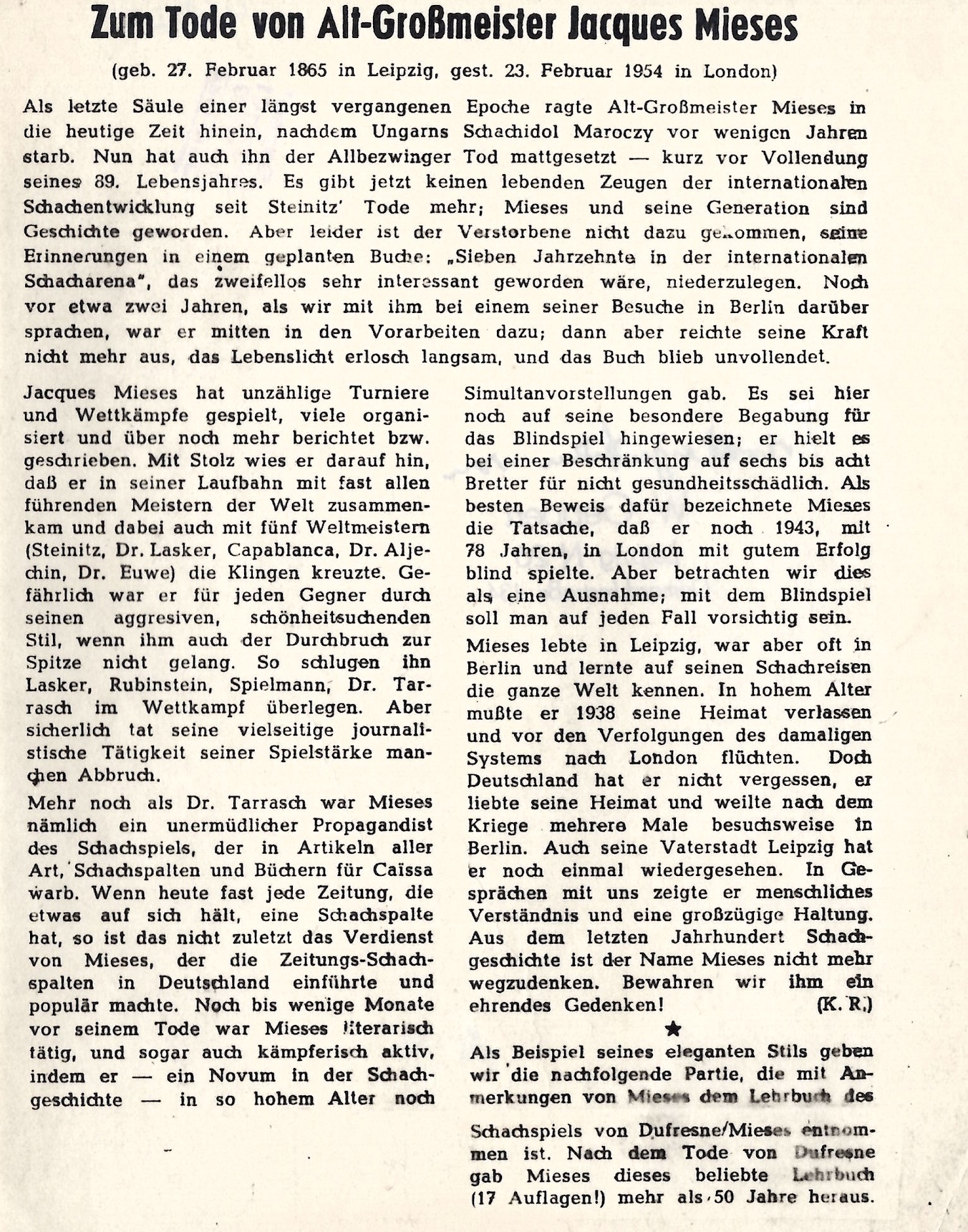 Jacques Mieses starb am 23. Februar 1954 in London, kurz vor seinem 89. Geburtstag. Dieser deutschsprachige Nachruf erschien kurz darauf in einer unbekannten Zeitung oder Zeitschrift. Das Kürzel (K. R.) deutet auf Kurt Richter hin, den bekannten Berliner Schachmeister und -journalisten.